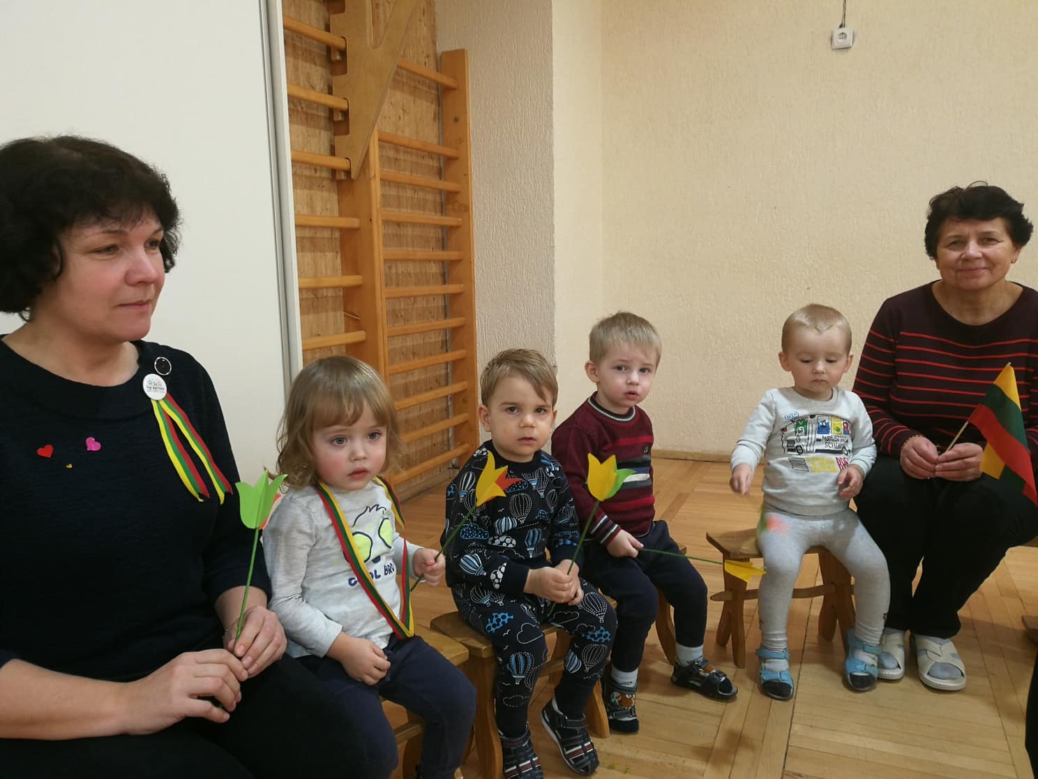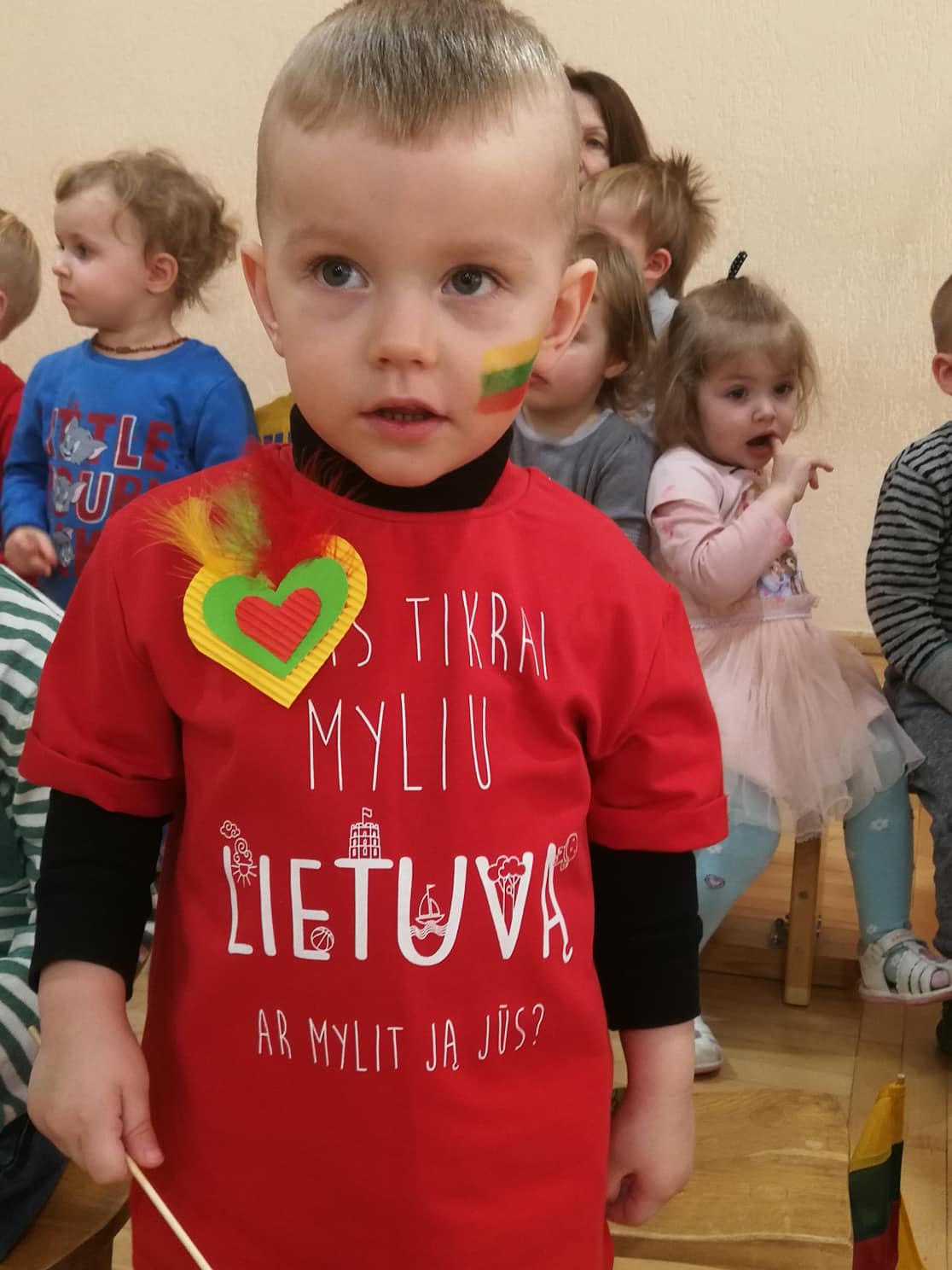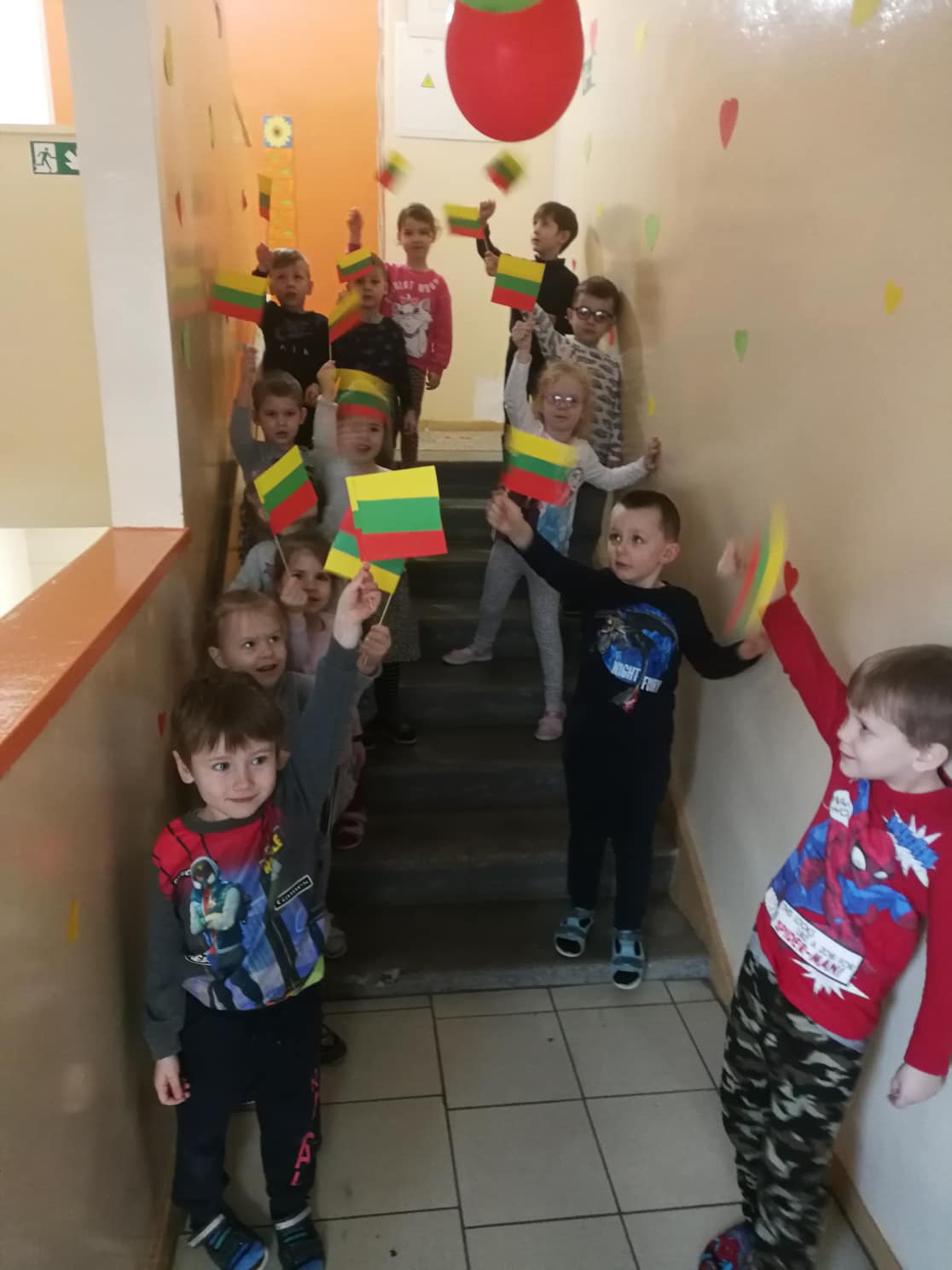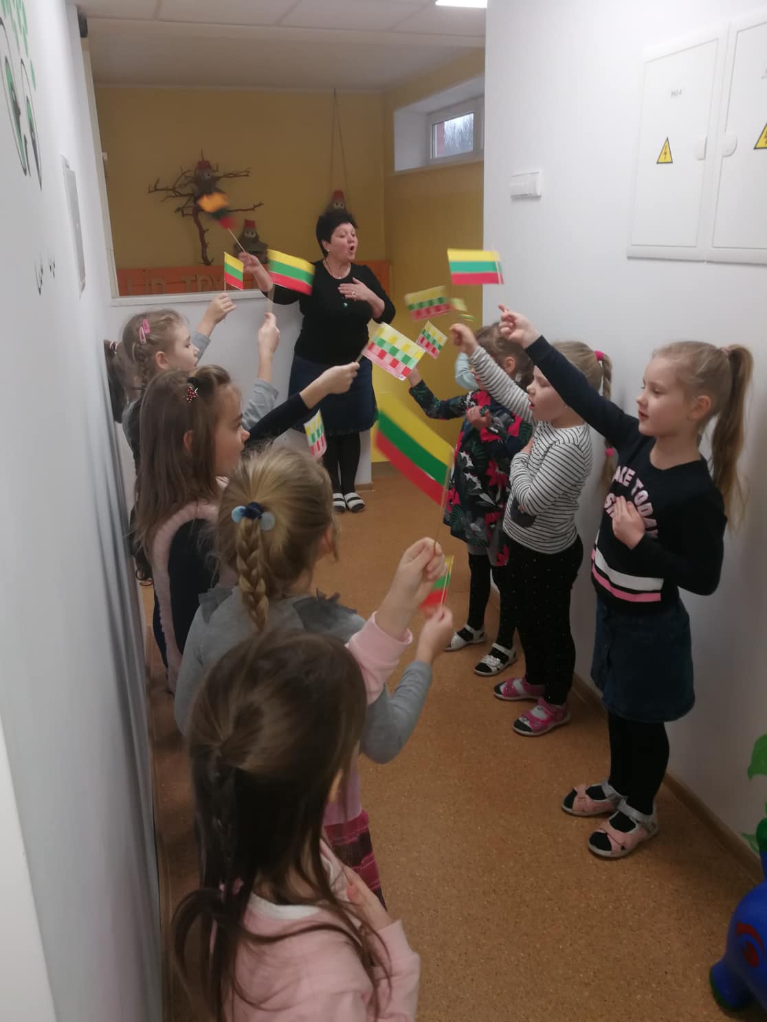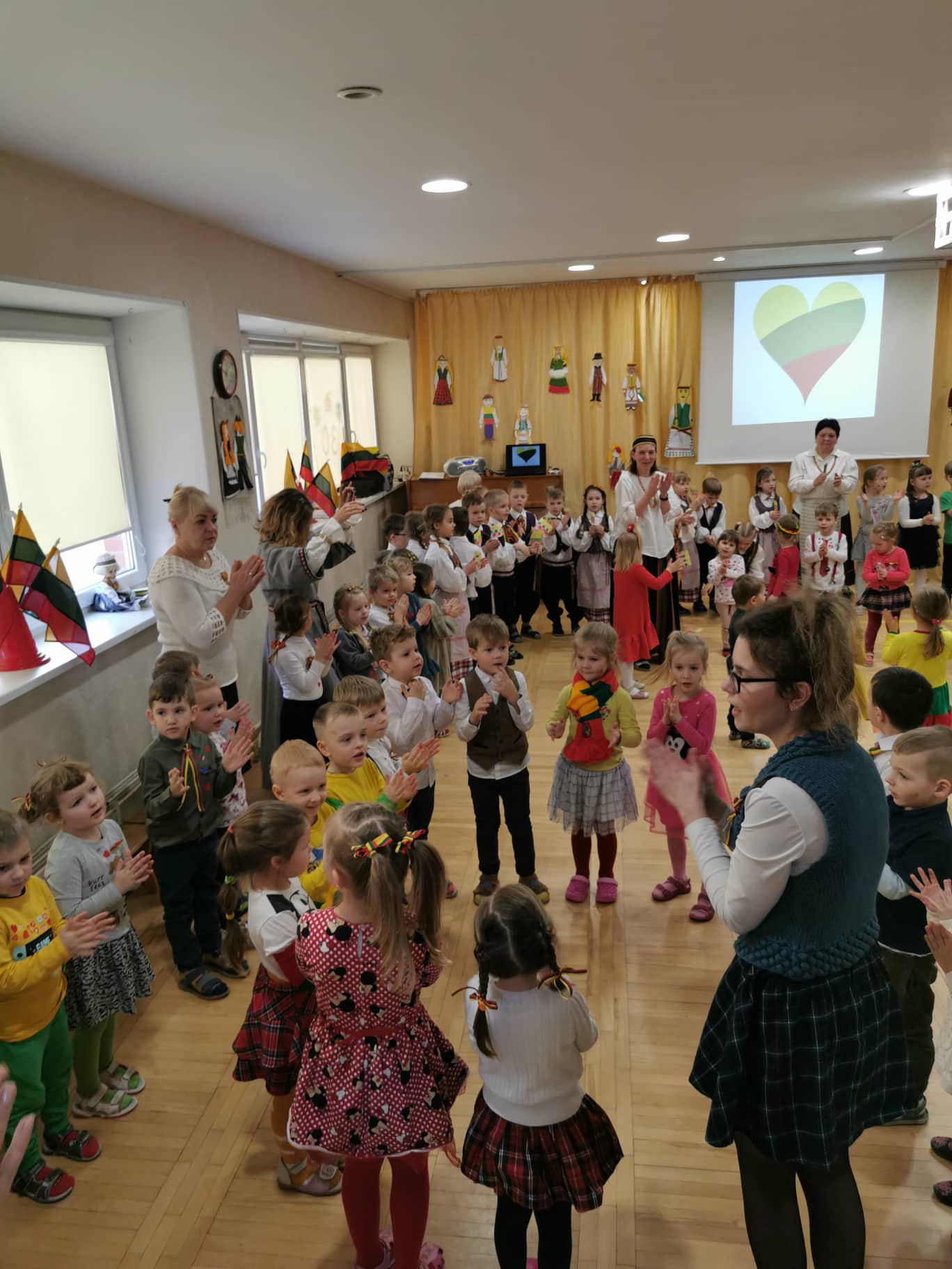 Visą savaitę, ryte iškilmingai giedojome Lietuvos himną skirtingose įstaigos vietose, gaminome įvairiusius darbelius, žaidėme žaidimus ir kitaip ruošėmės Lietuvos gimtadieniui. O penktadienį vyriausieji darželio vaikai pakvietė visus į šventę, kurioje ir šokome, ir dainavome, ir eiles deklamavome.