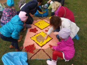 Darželyje likę vaikai taip pat neleido laiko veltui. Kartu su auklėtojomis vaikai kūrė rudens mandalas, kuriomis galite pasidžiaugti darželio kiemelyje iki rugsėjo 29 dienos.