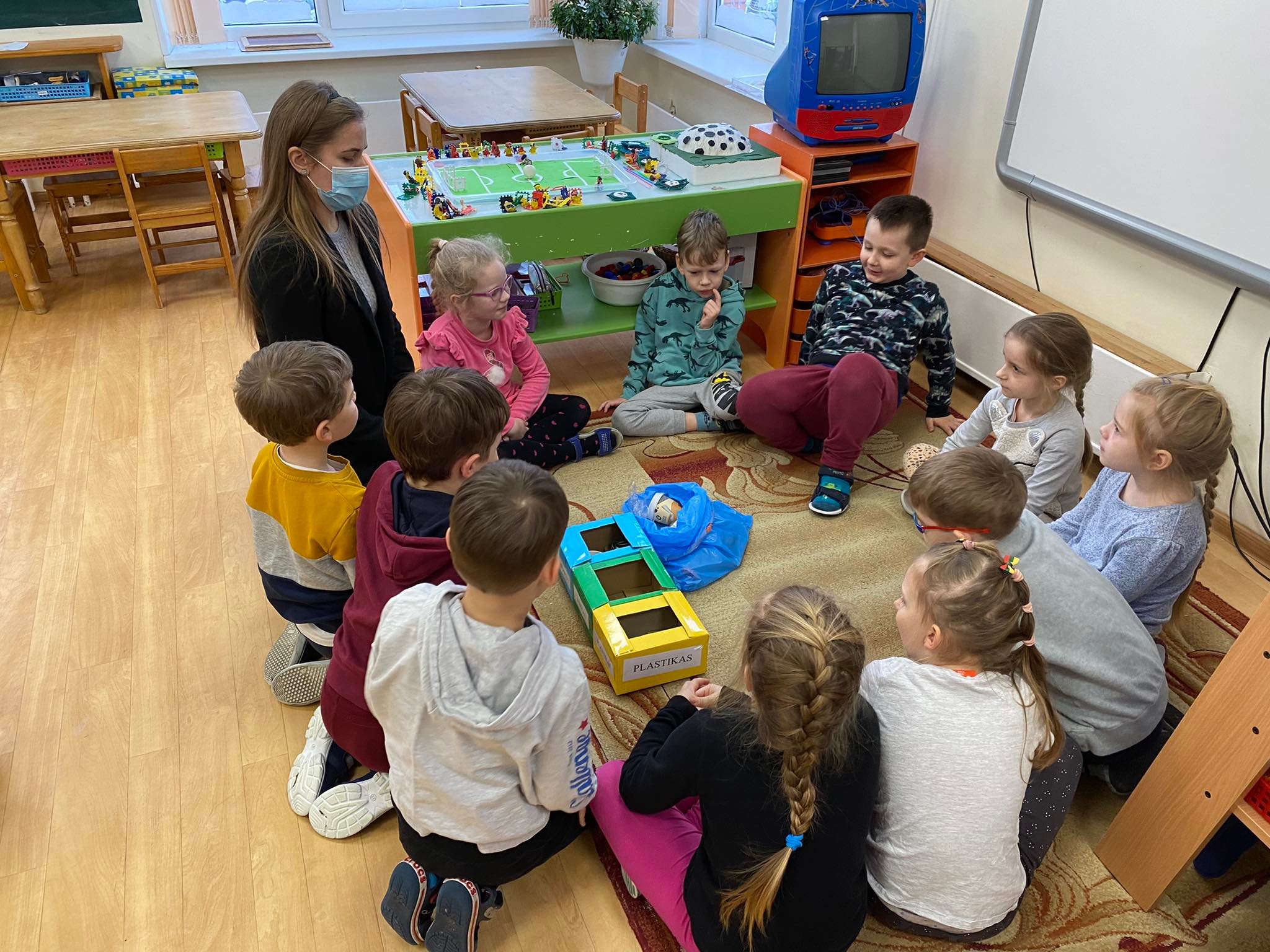 Vasario mėnuo buvo skiriamas tvarumui. Su „Naminukai“, „Spindulėliais“, „Pabiručiais“, „Kodėlčiukais“ kalbėjome apie rūšiavimą. Išsiaiškinome, ką šis žodis reiškia, kodėl reikia rūšiuoti, sužinojome, kokie yra konteineriai ir kokias atliekas į juos reikia mesti. Taip sužinojome, kad elementus reikia mesti į atskirą konteinerį. Radome elementų konteinerius ir darželyje.