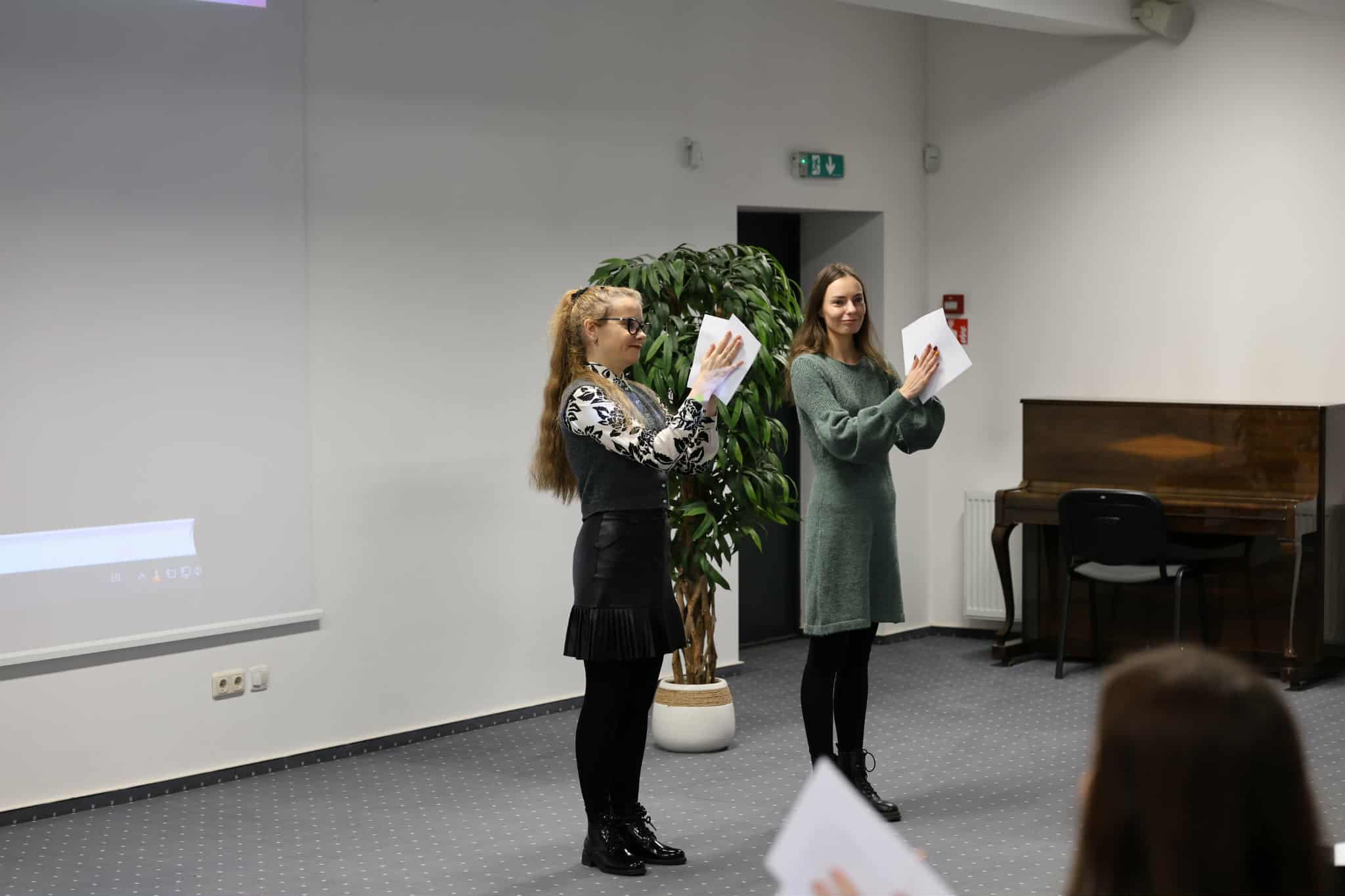 laikinai einanti direkotoriaus pareigas Reda Ponelienė ir direktorės pavaduotoja ugdymui Eglė Galkauskienė pristatė pranešimą "Kai teorija ir praktika šoka bendrą šokį";