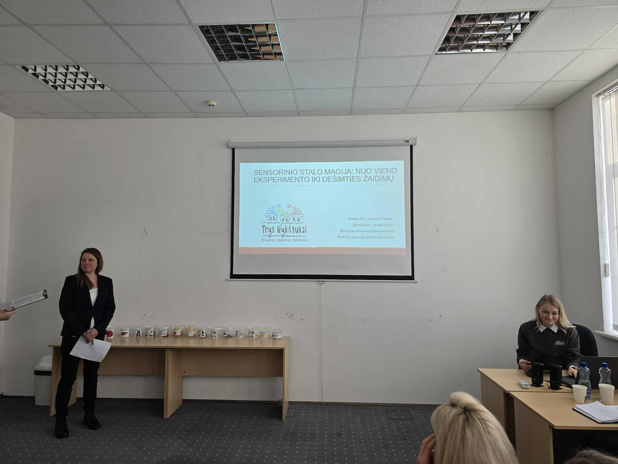 mokytoja Kristina Lazdauskienė ir mokinio padėjėja Živilė Varonienė pristatė pranešimą "Sensorinio stalo magija: nuo vieno eksperimento iki dešimties";