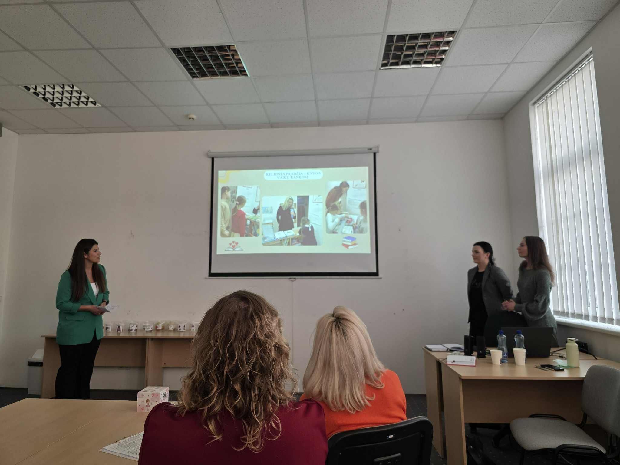mokytojos Rūta Laucytė ir Aida Šimaitienė bei logopedė/specialioji pedagogė Daiva Silkytė-Čeredničenko pristatė pranešimą "Pasakų pristatymai - kelias į kalbinės kompetencijos plėtojimą";