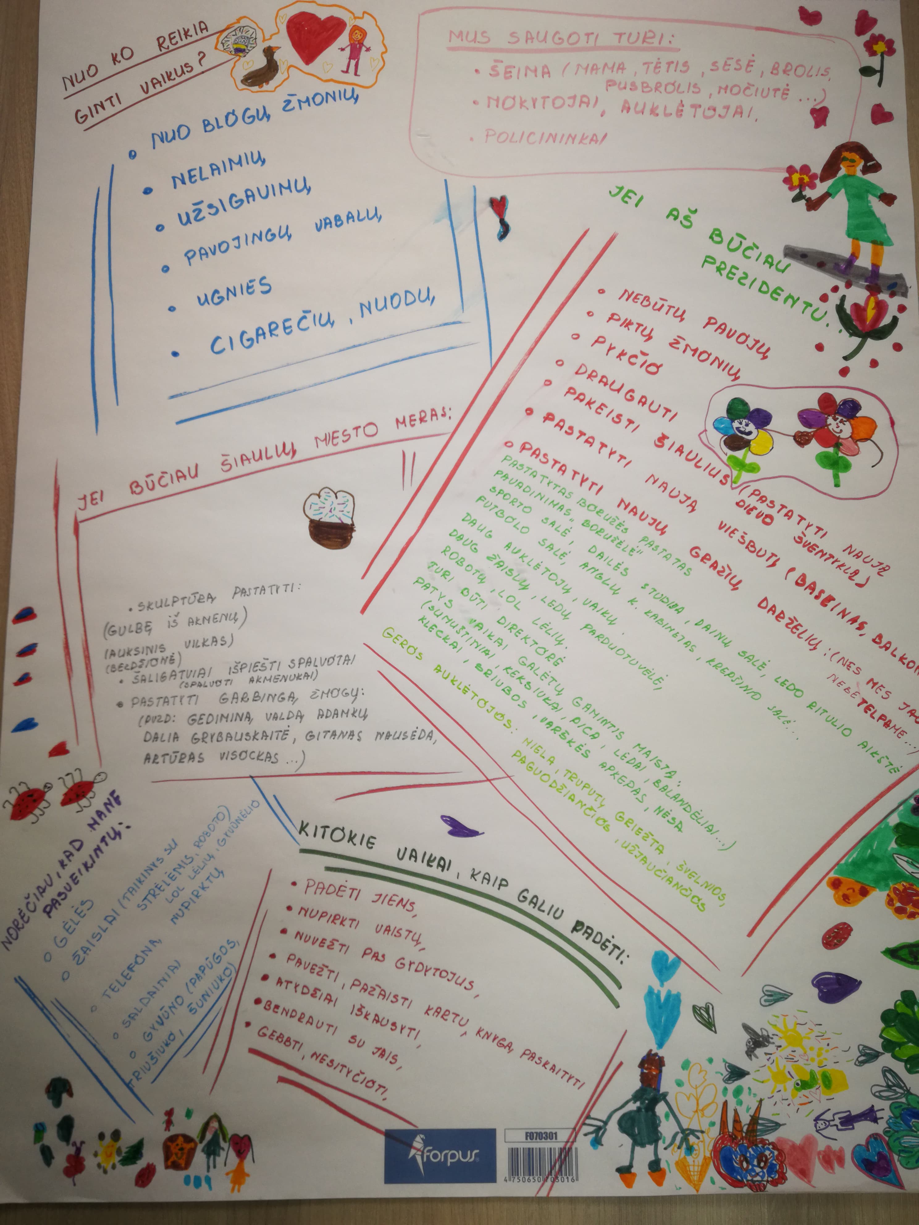 turėtų būti daugiau darželių (... ,,nes mes jau nebetelpame"). Darželis galėtų būti boružėlės formos. O ten turėtų būti: sporto salė, dainų salė, dailės studija, krepšinio salė, ledo ritulio salė...). Taip pat turėtumėme patys gamintis maistą ir svarbiausia turėtų dirbti geros auklėtojos: mielos, truputį griežtos, švelnios, paguodžiančios, užjaučiančios ir t.t..