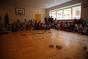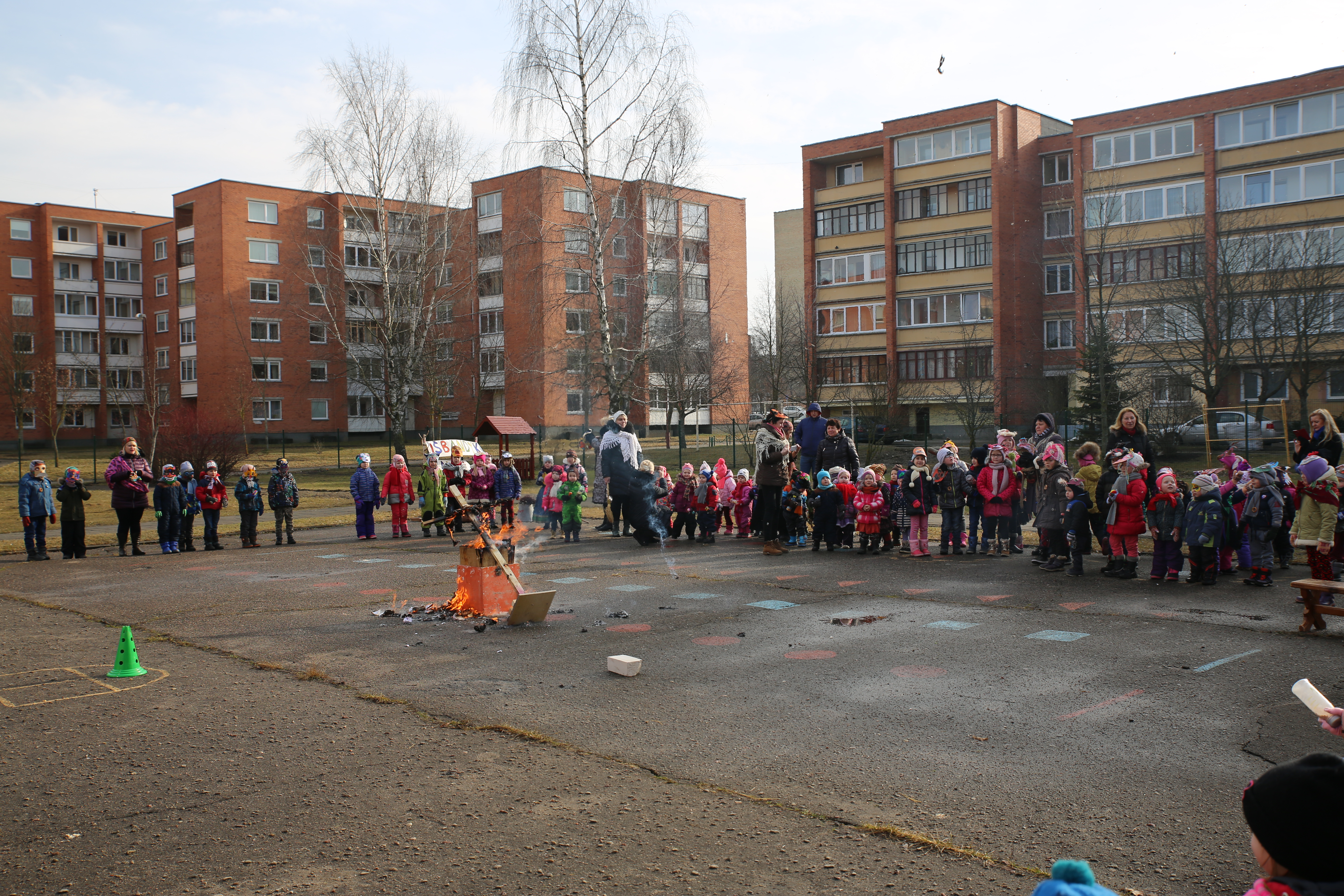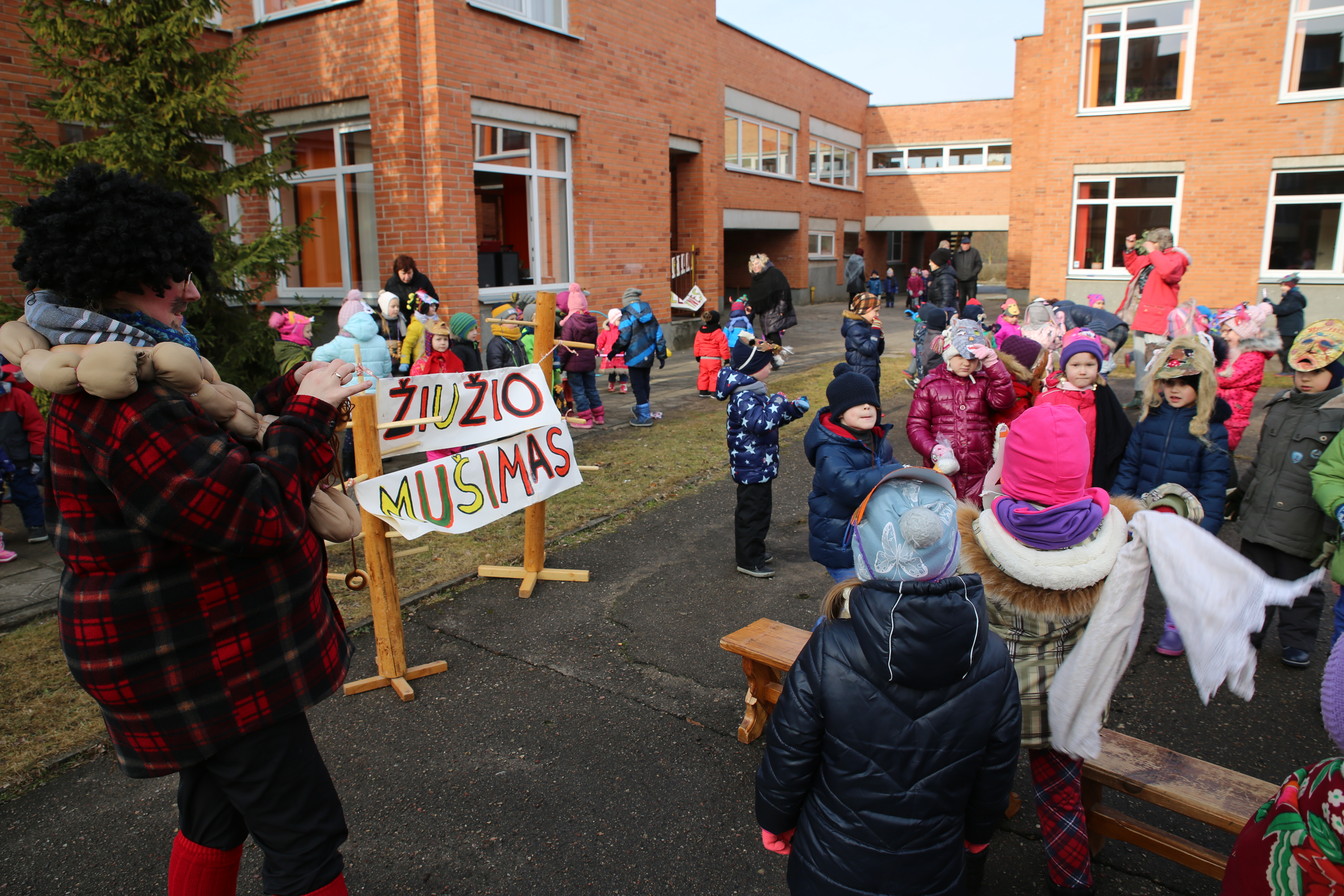 Vasario 28 d. žiemos palydėtuvės vyko nuo pat ryto. Persirengėliai aplankė visas įstaigos kerteles, vėliau rinkosi salėje, kur stebėjo Lašininio ir Kanapinio dvikovą. Pavasario draugas Kanapinis kaip pergalės atributą gavo Lašininio draugę Morę, kuri, kartu su negerais darbais, buvo sudeginta darželio kieme. Vaikai kiek įmanydami varė žiemą iš kiemo – rungtyniaudami, besigalynėdami, dainomis, šūksniais, barškalais. Vėliau vaišinosi Užgavėnių patiekalu – blynais.